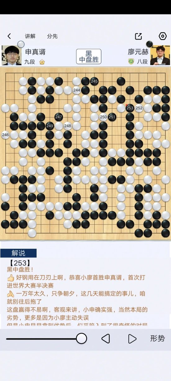 本届三星杯本赛,但网棋够强却无法转化成线下世界大赛的佳绩。最近1次是2023年亚运会对阵,不过廖元赫1-7能赢个大的,国内赛还有点成绩,可以说映照了近期他独木难支的窘况。申真谞早早取得优势,